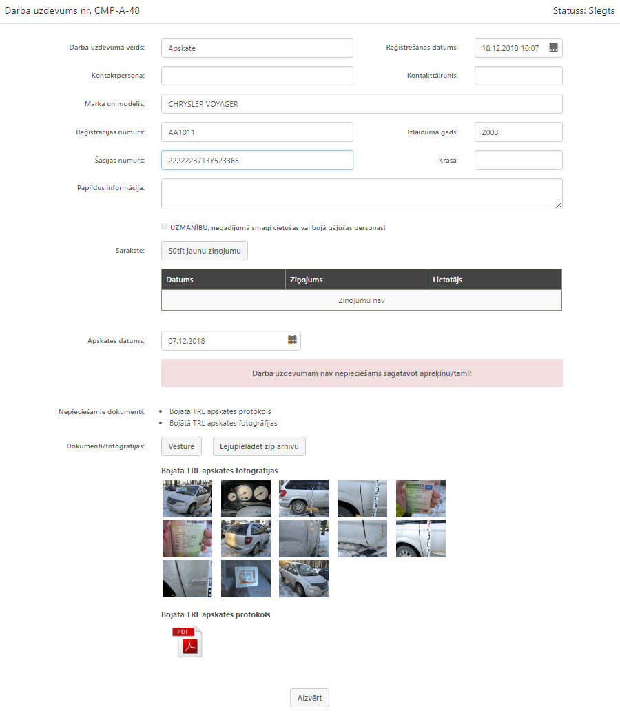 Sadarbības partneri apdrošinātāju atsūtītos apskates aktus/darba uzdevumus var atvērt pa tiešo no e-pastiem vai arī redzēt visu sarakstu sadaļā ‘Darba uzdevumi/Darba uzdevumu saraksts’. Forma ļauj norādīt ar apskati saistītos datus un pievienot dažādus dokumentus un apskates fotogrāfijas.