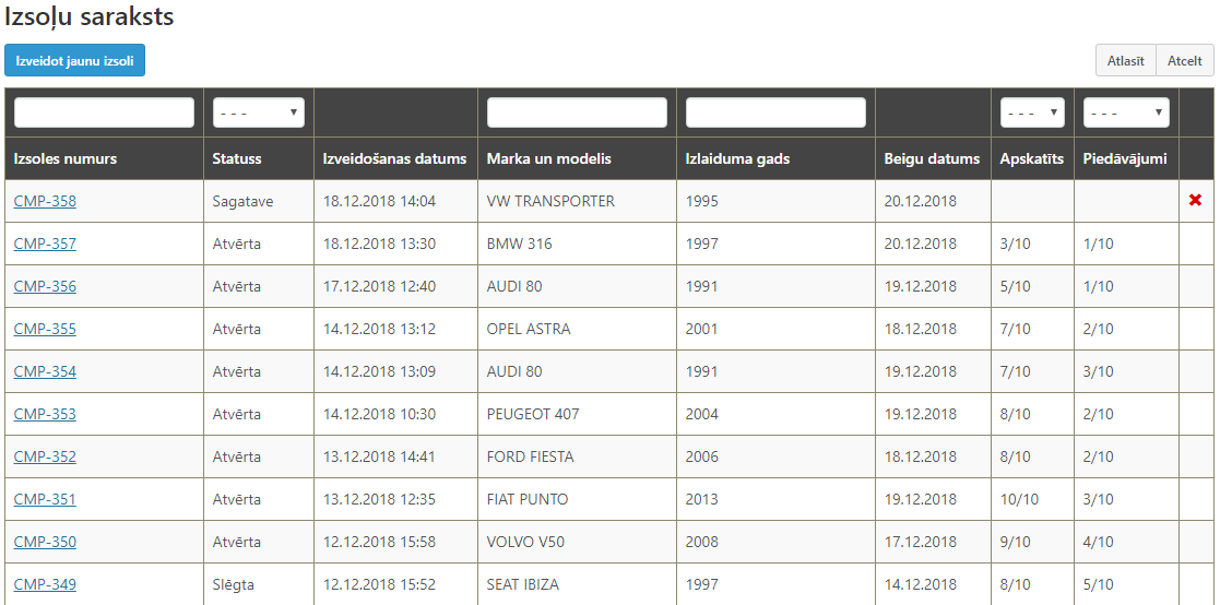 Platforma carsa.lv (car service assistance) nodrošina ērtu un uzskatāmu Izsoļu un Apskates aktu/Darba uzdevumu orgnizēšanu